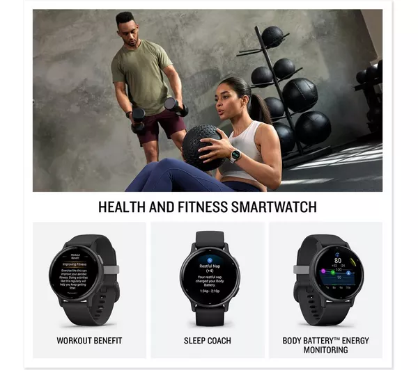Keeping active is important but so is getting your rest. This Garmin vívoactive 5’s Body Battery energy monitoring gives you personalised insights into your sleep, naps, stress levels and workouts. It helps you better understand when you need to take it easy or when you’re primed and ready to go again. The Sleep Coach creates your very own sleep score with handy tips on how to get a better night’s kip. And with the Morning Report, you’ll be ready to hit your fitness goals as soon as you wake up. It sends loads of useful information like your sleep patterns and daily workout routines right to your wrist, so you won’t have to reach for your phone.